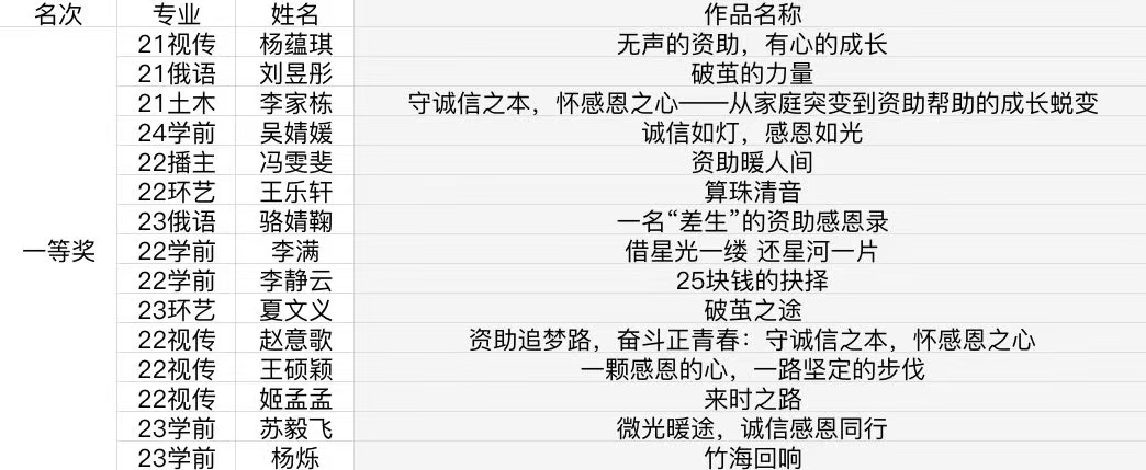 经过激烈的竞争与严格的评审,本次活动共评选出院级一等奖15名、二等奖20名、三等奖30名。这些获奖作品主题鲜明、内容丰富,围绕诚信主题,从不同角度、不同层面深入阐释了对诚信的理解与感悟。