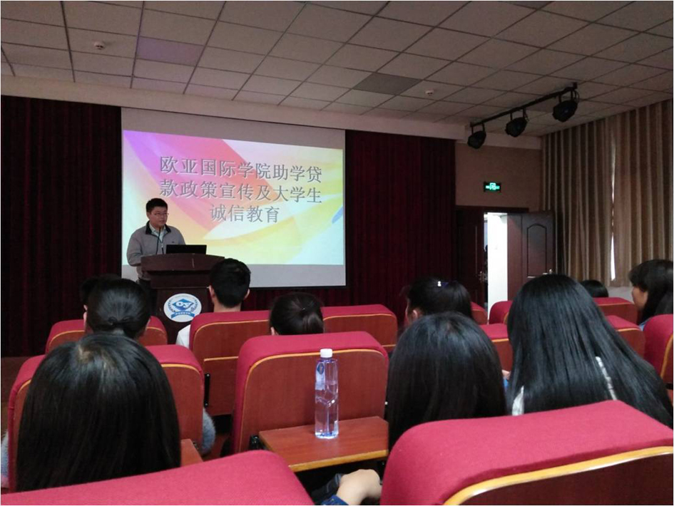 2016年4月28日下午,学院助学贷款政策宣传及诚信教育专题会议在二楼报告厅召开,学院资助工作负责人宿云龙老师主持会议,全院办理生源地及校园地助学贷款的近百名学生参加会议。