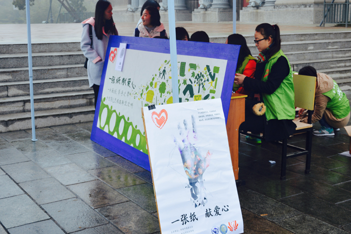 2015年11月19日至20日,由学院青年志愿者协会与开封市慈善总会共同承办、河南大学法学院青协联办的“一张纸 献爱心”行动在明伦校区开展。