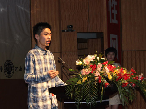 2014年5月21日晚,河南大学第十届英语演讲比赛(非专业组)总决赛在金明校区计算机大楼二楼报告厅举行,我院选手许逸骅凭借复赛的精彩表现挺进决赛,比赛盛况在新老校区大屏幕同步直播。
