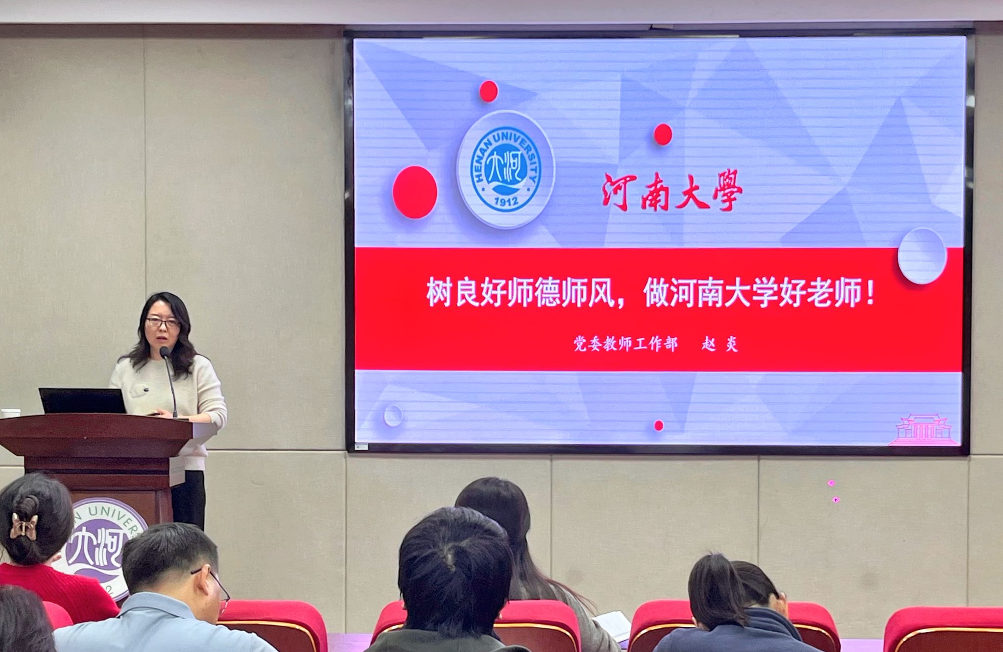 赵炎以“树良好师德师风,做河南大学好老师”为主题,围绕“师德师风的重要性、高校师德师风规范要求、做什么样的好老师”三个方面进行了详细的讲解。她结合工作实际,分析了当前师德师风建设面临的新形势和新挑战,阐述了新时代教师肩负的新使命。赵炎表示,抓好师德师风建设是打造高素质教师队伍的内在要求和重要保证,也是教师自觉践行立德树人根本任务的关键,希望大家始终牢记为党育人、为国育才的初心使命。