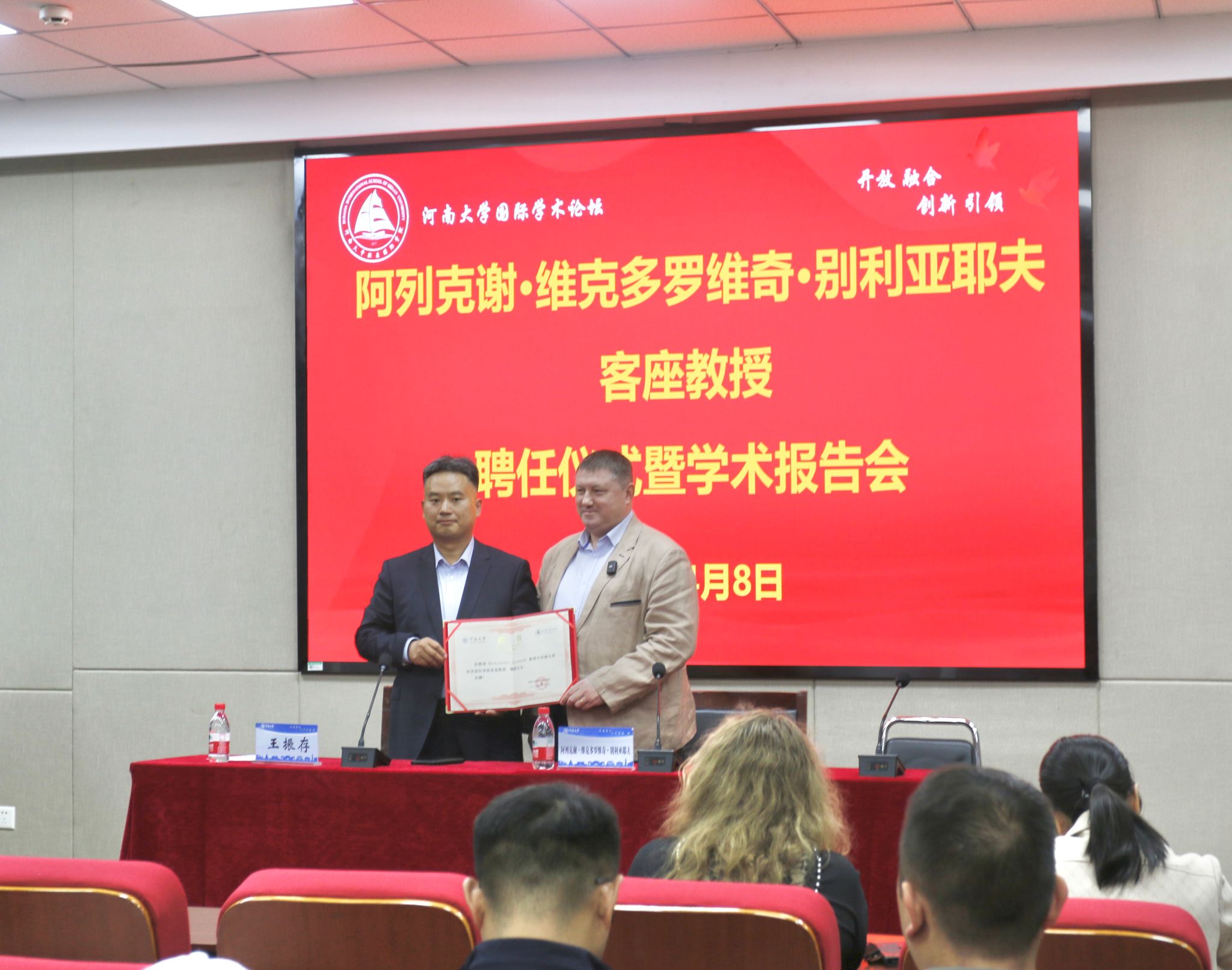 随后,王振存为别利亚耶夫颁发客座教授聘书。别利亚耶夫教授研成果斐然,具有多年专业教学经验与实践,致力于推动河南大学与白俄罗斯国立大学新闻专业的交流与合作,推进双方专业学科建设国际化。