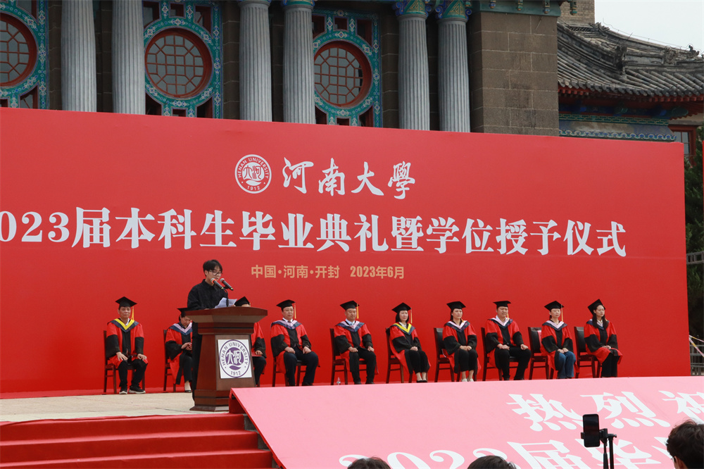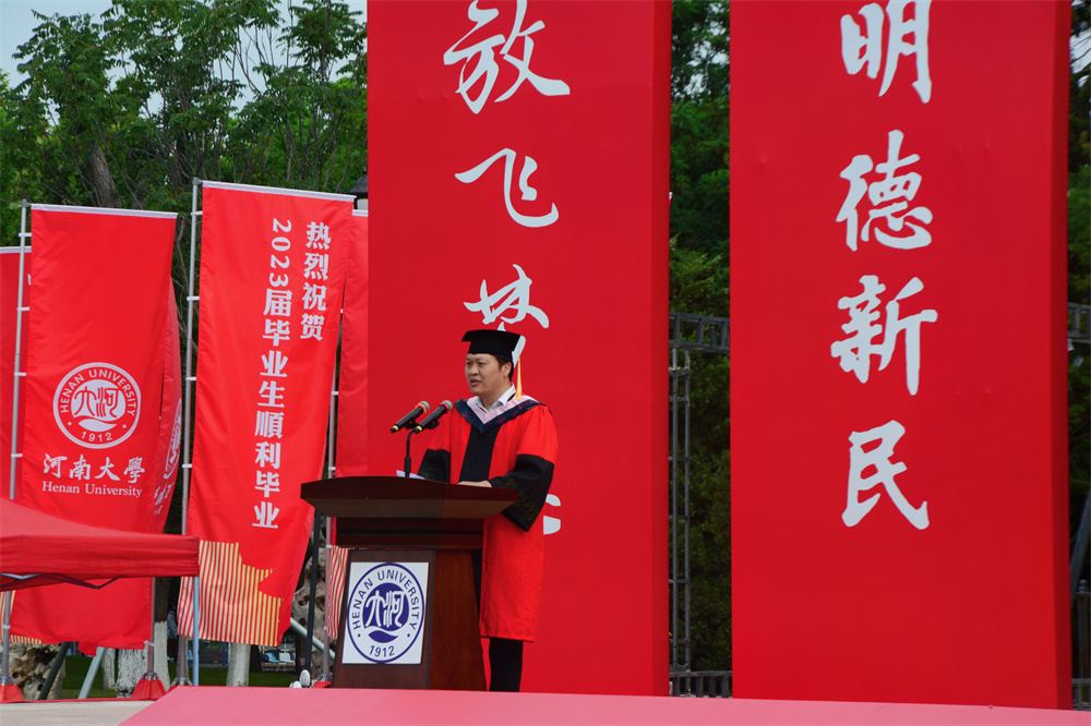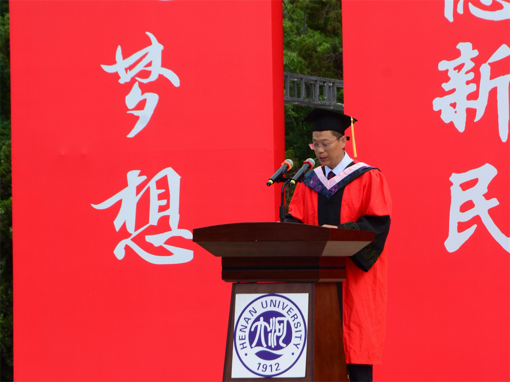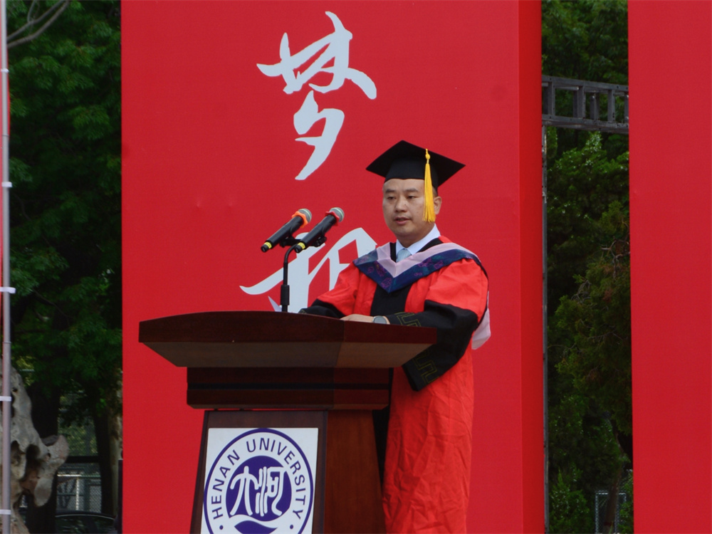 王振存代表学院向圆满完成学业的全体毕业生表示热烈祝贺。他表示,毕业生经历了无比珍贵的四年,见证了建党百年和新中国成立70年的盛典、党的百年发展史;经历了河南大学迈入“双一流”“双航母”多战略叠加的最佳发展机遇期;还克服困难,战胜了疫情。他高度赞扬了毕业生们自强不息、奋斗拼搏的精神,希望他们不忘过往经历,不断前进。最后他分享了几句话送给毕业生同学:一是要志存高远。做到胸怀祖国、心忧天下、服务人民、放眼世界、着眼未来。二是要把稳航向。把稳人生航向,学会选择,心存敬畏。三是要脚踏实地。既要仰望星空、胸怀远大理想,又要脚踏实地,发扬钉钉子精神,过好人生每一天,走好人生每一步。四是要终身学习。养成一生学习的好习惯。五是要积极达观。积极乐观面对人生,不断提升耐挫力。六是要谨记母校教诲。恪守“明德新民,止于至善”的校训,发扬“百折不挠、自强不息、自信拼搏、创新开放”的精神,传承“融汇中西、育人为本、内涵建设、特色发展”的院训,不忘初心,勇担使命,勿忘母校,常回家看看。