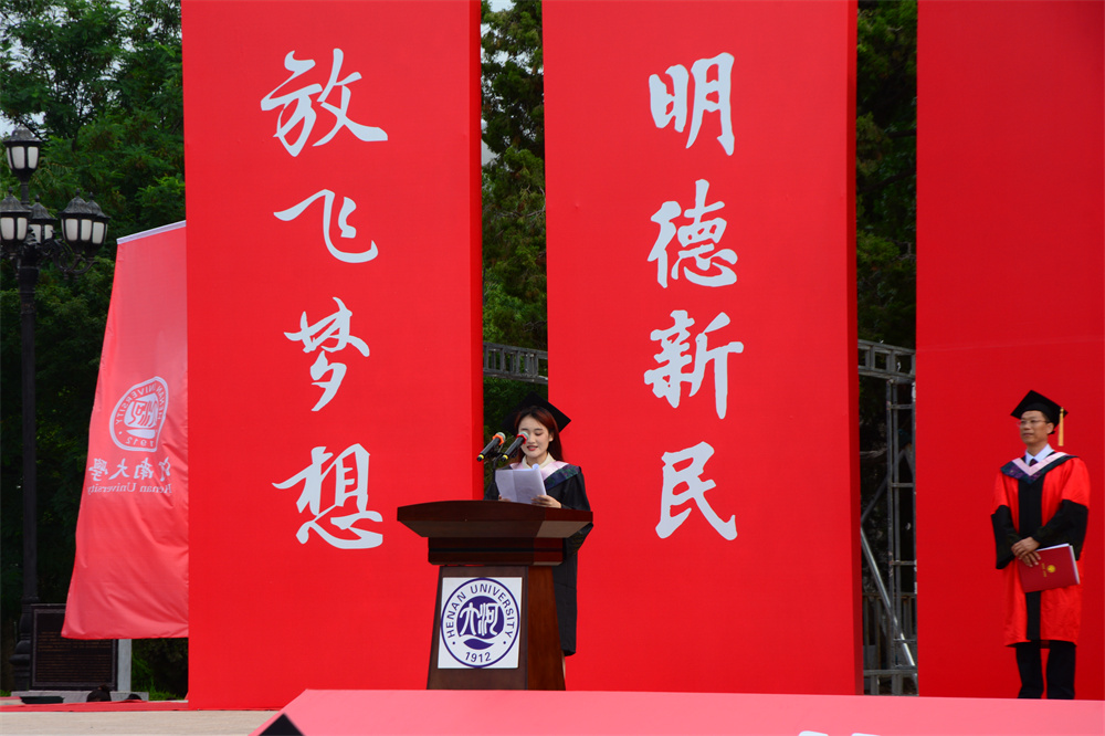 2019级播音与主持艺术专业学生练一涵代表毕业生发言。她引用校歌中的“嵩岳苍苍,河水泱泱”,表达了对母校深深的热爱与不舍,以及对老师们由衷的感谢。在发言的最后,她对学弟学妹们表达了期待与鼓励。