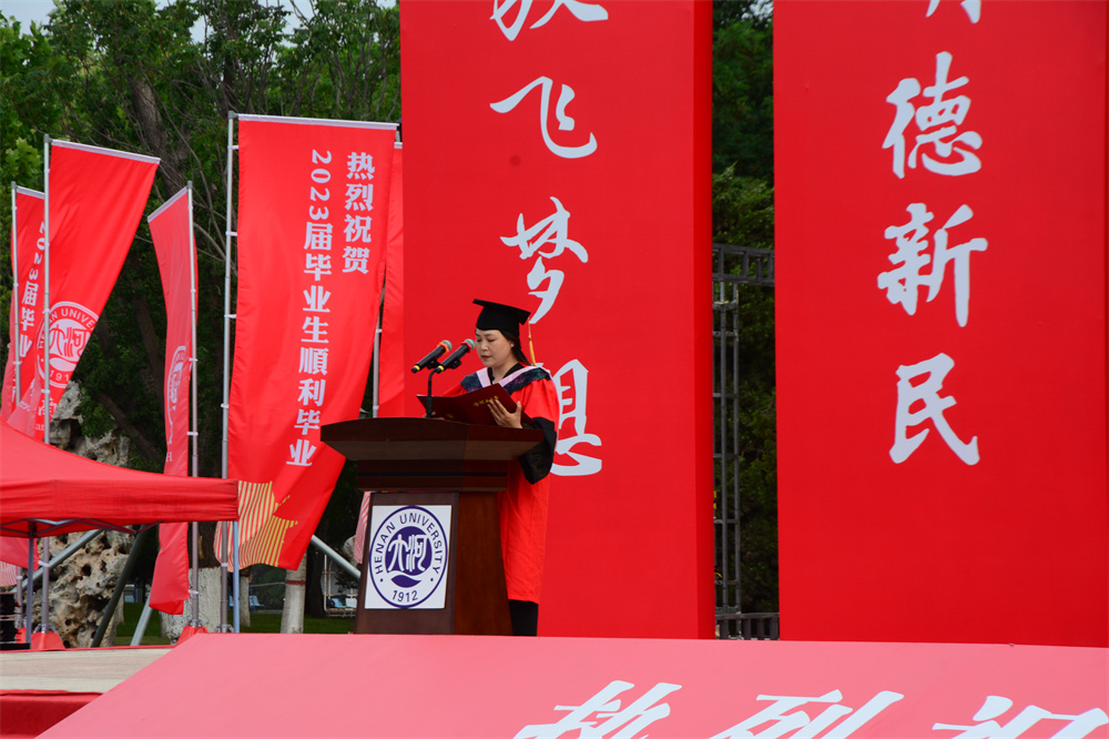 仪式在庄严的国歌中拉开序幕。副院长苏芳芳宣读了学校学位评定委员会关于对2023届土木工程、通信工程、金融数学、电子商务、播音与主持艺术、视觉传达设计、环境设计、俄语8个本科专业654名毕业生分别授予工学、经济学、管理学、艺术学、文学学士学位的决定。