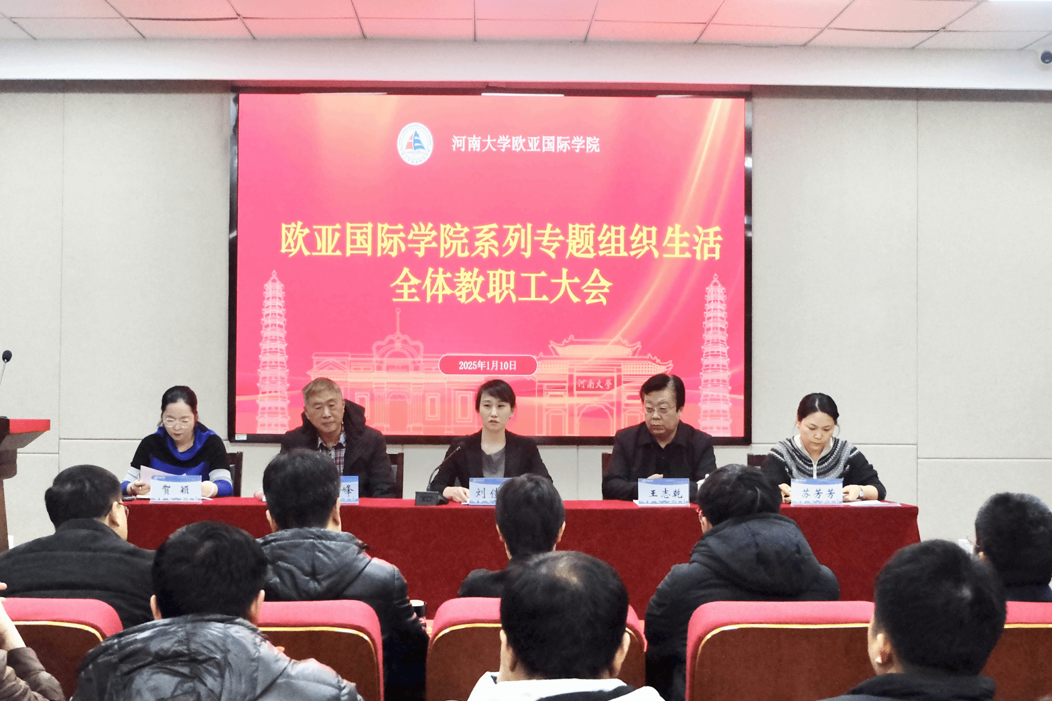 在院二楼报告厅召开系列专题组织生活全体教职工大会,学院全体教职工、离退休教师和学生代表参加会议。会议由学院党委书记刘佳明主持。