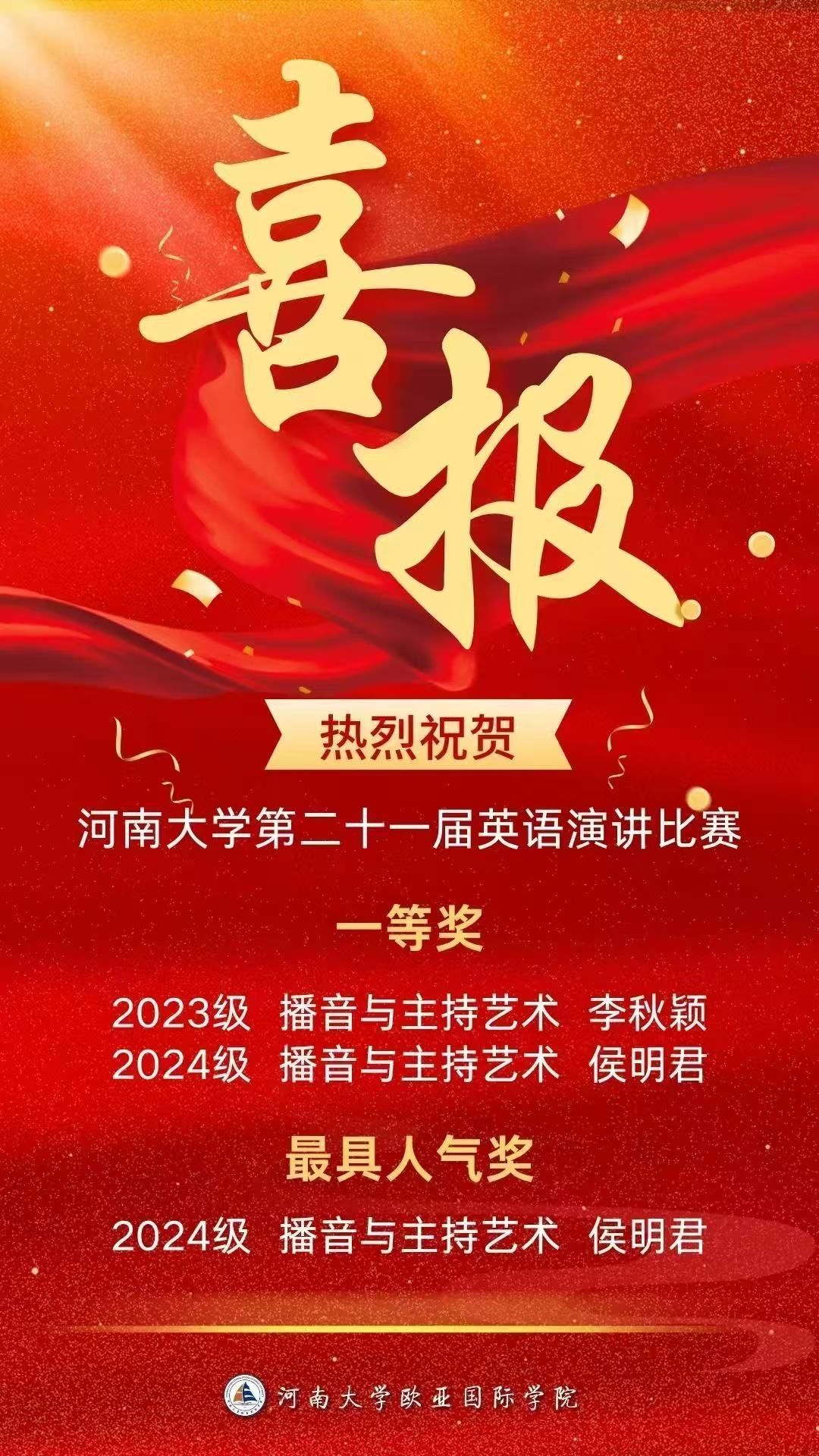 5月29日晚,河南大学第二十一届英语演讲比赛总决赛落下帷幕。我院2023级播音与主持艺术专业李秋颖、2024级播音与主持艺术专业侯明君在比赛中表现出色,双双获得一等奖,侯明君同学还获得了“最具人气奖”。