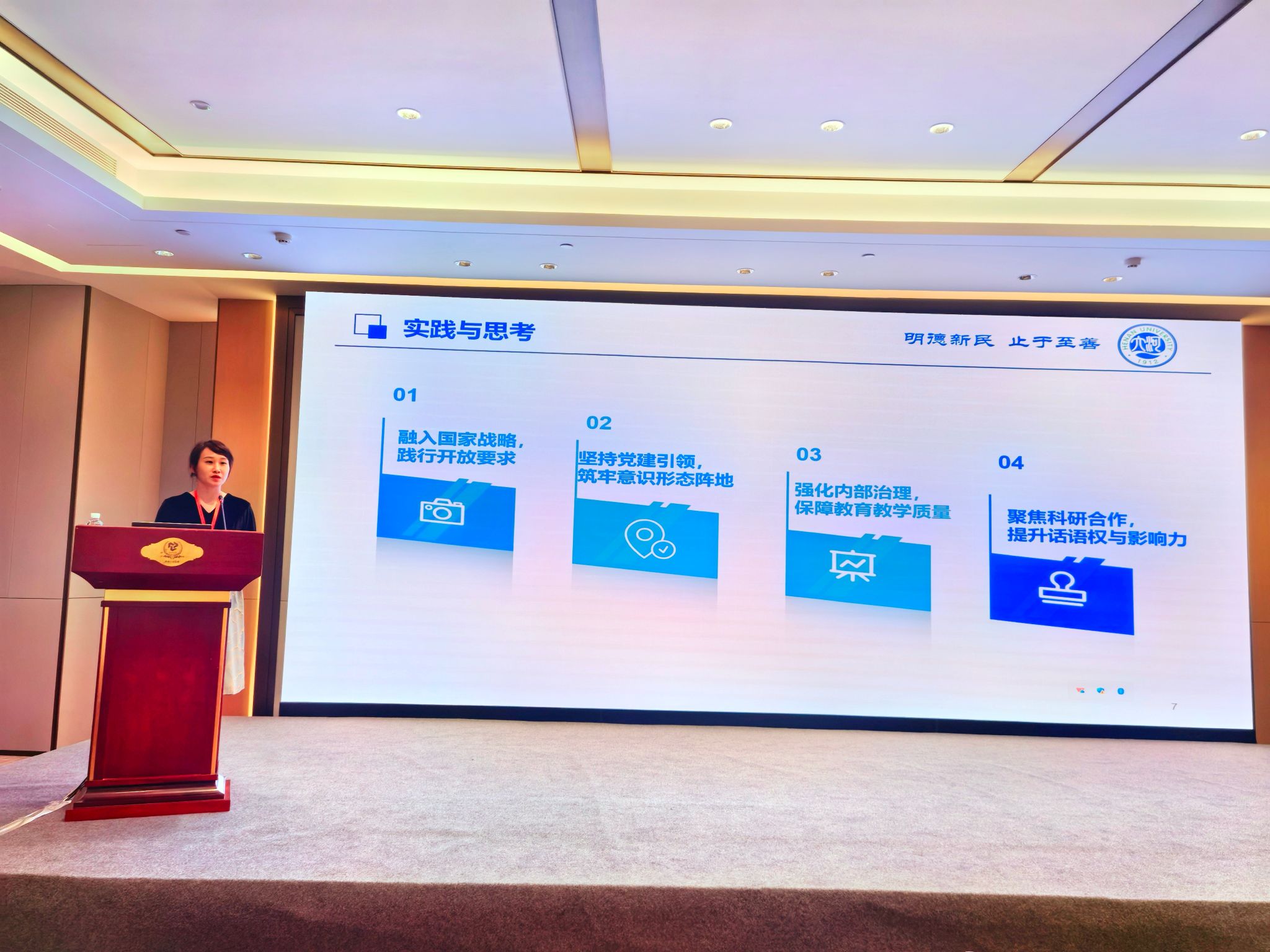 刘佳明介绍了河南大学国际化办学开展情况及SPBO手机版 中外合作办学质量保障体系与人才培养成效。她表示,SPBO手机版 着力融入国家战略、践行教育对外开放,坚持党建引领、筑牢意识形态阵地,强化内部治理、保障教育教堂质量,聚焦科研合作、提升话语权与影响力,逐步形成了具有鲜明特色的运行机制、管理模式与育人路径,构建了内容完善、运行科学、保障有力的中外合作办学治理体系,实践成效不断显现。未来,学院将继续深化改革,完善中外合作办学管理体制机制,做好服务国际化人才培养和服务学科建设两项重点工作任务。