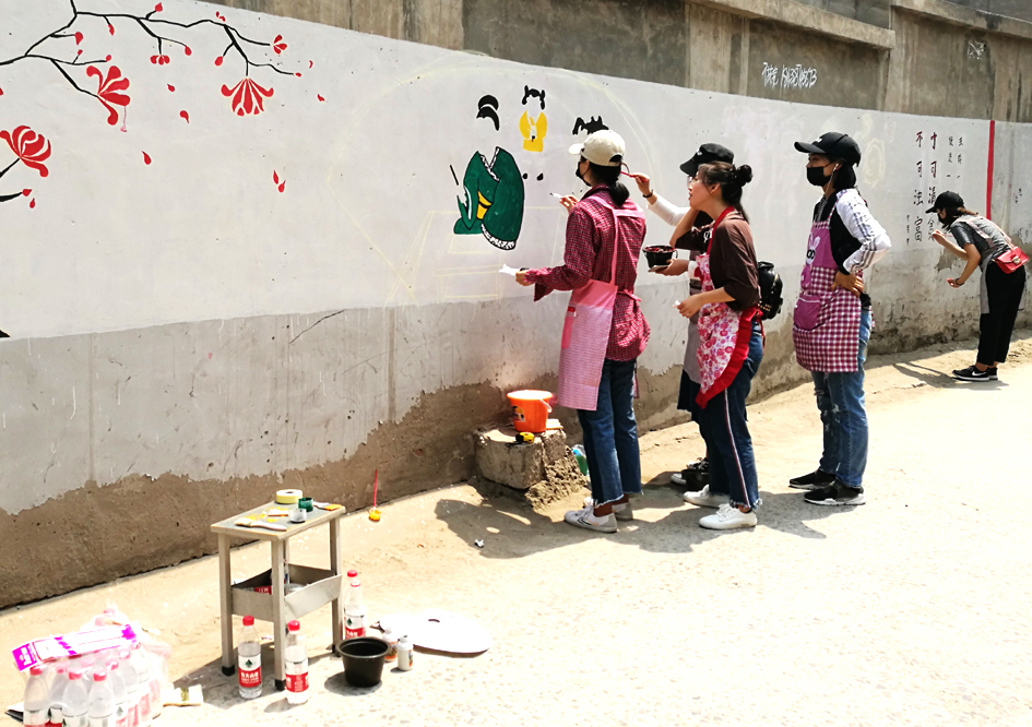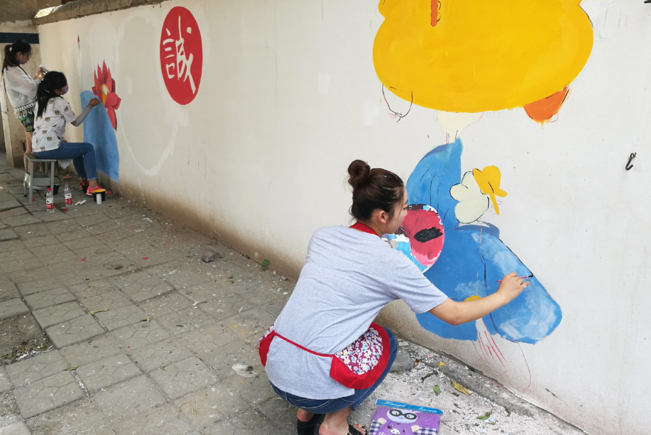 阳光炙烤下,在白磊老师的指导下,同学们顶烈日、战高温,分散于十个街区,全身心的投入墙绘。54名分组分工,有的负责写字,有的负责着上色,有的负责规划设计,有的则进行后期的处理等,细描构图、冲水调色、上色涂彩,短短的时间内,他们手中的画笔勾勒出一幅幅充满文明风尚的墙体画。一天下来,同学们高质量地完成了全部街景墙画,绘制面积近4000平方米,墙绘成为街区文明创建的“新阵地”和一道独特靓丽的风景线。