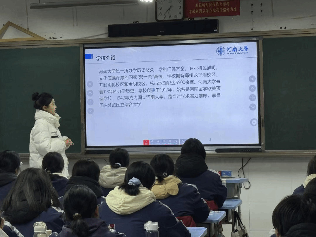 通过主题宣讲、座谈交流等形式,与师生亲切互动,全方位展示河南大学的办学特色、学科优势与人文底蕴,讲述河大故事,传播河大声音。他们以亲身经历分享大学生活的精神与成长,用真诚的话语传递备考经验与人生感悟,引导学弟学妹明晰方向、坚定信念,在追梦路上勇毅前行。