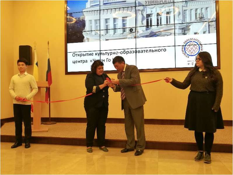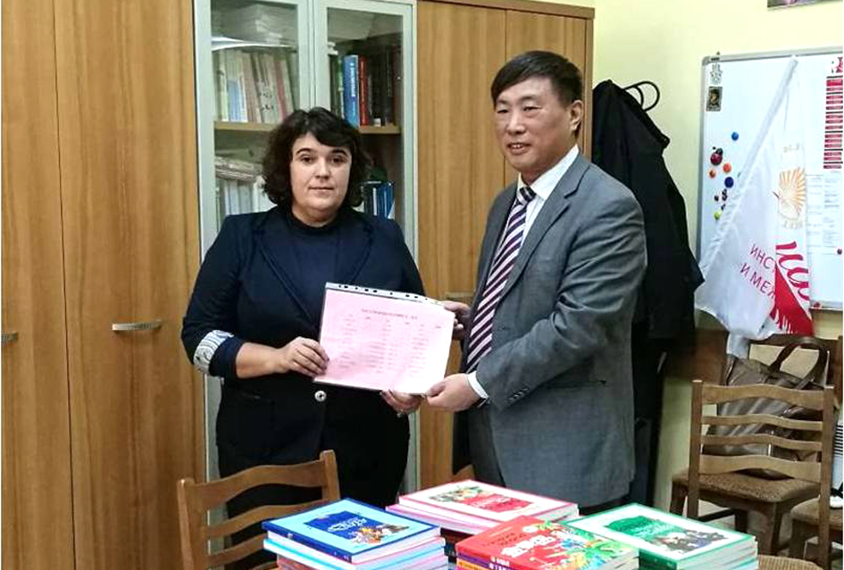 仪式上,谷跃峰代表学院对南联邦大学中文教育中心的成立表示祝贺,简要介绍了办学双方在项目合作以来的发展情况和取得的巨大成效。谷书记指出,南联邦大学中文教育中心的成立标志着双方合作办学跨上新的台阶,对进一步推进双方办学水平和国际化进程都具有重要作用,也相信在中国“一带一路”倡议新形势下,双方办学会更加深入和广泛。谷跃峰和南联邦大学语言学院院长娜塔莉亚共同扣系象征友好合作的红丝结,并代表学院向语言学院赠送100本中文书籍;中俄两方的学生自编自演了精彩的文艺节目。
