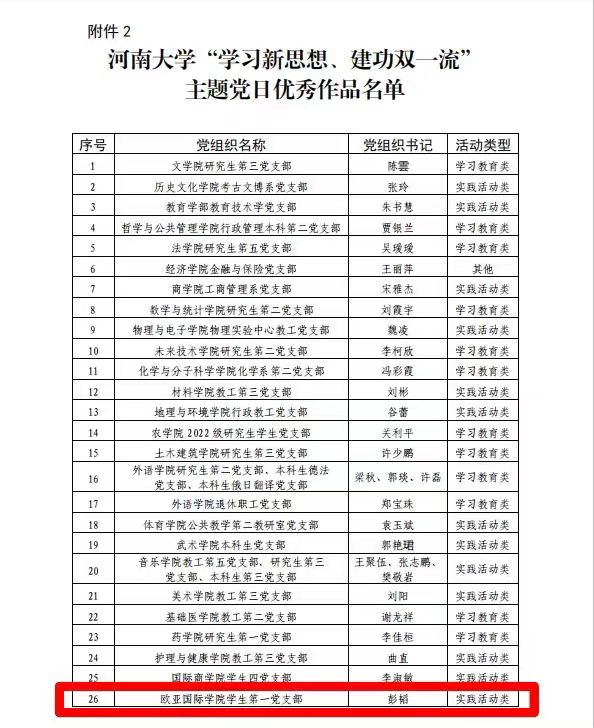 近日,在学校“学习新思想、建功双一流”系列活动和“河南大学第二批党建工作标杆学院、样板支部培育创建单位”验收工作中,学院取得了优异的成绩。