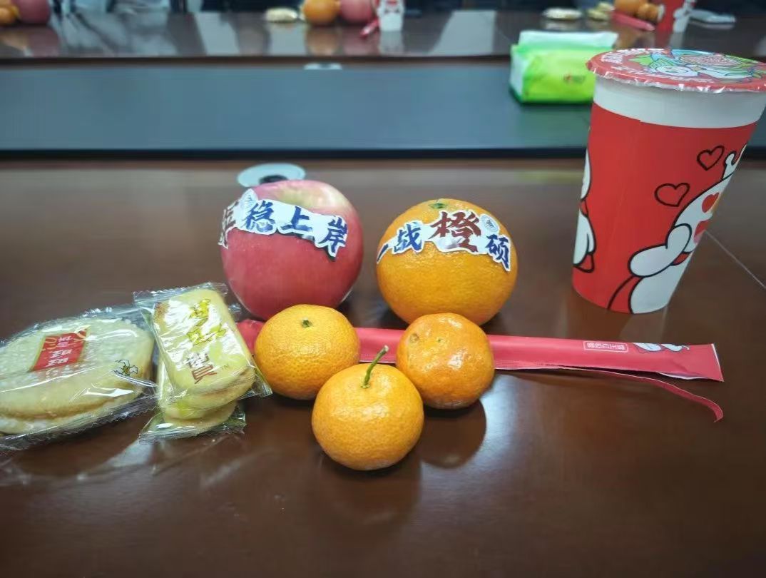 为表达学院的关爱与支持,现场特别为考研学子们精心准备了慰问品:寓意一战“橙”硕的橙子和“苹”稳上岸的苹果,印有“金榜题名”的旺旺大礼包等。学院领导和老师们亲手将慰问品送到每位同学手中,勉励大家珍惜时间、奋力拼搏,用实际行动书写考研之路的精彩答卷。