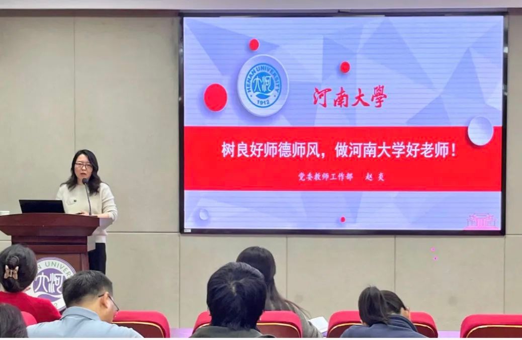 赵炎以“树良好师德师风,做河南大学好老师”为主题,围绕“师德师风的重要性、高校师德师风规范要求、做什么样的好老师”三个方面进行了详细的讲解。她结合工作实际,分析了当前师德师风建设面临的新形势和新挑战,阐述了新时代教师肩负的新使命。赵炎表示,抓好师德师风建设是打造高素质教师队伍的内在要求和重要保证,也是教师自觉践行立德树人根本任务的关键,希望大家始终牢记为党育人、为国育才的初心使命。