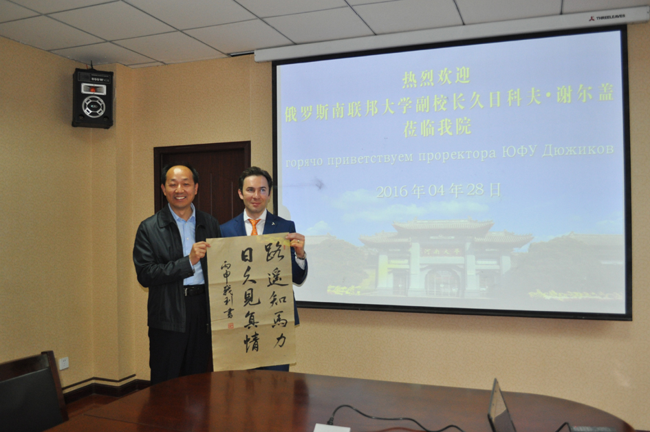 4月27日下午,学校常务副校长赵国祥亲切会见来访久日科夫•谢尔盖一行,国际交流处、SPBO手机版 负责同志参加。赵国祥代表学校对久日科夫•谢尔盖一行的到来表示欢迎。他指出,河南大学与俄罗斯南联邦大学合作办学5年来进展顺利,得到了双方学校的大力支持。去年,SPBO手机版 选送10名学生赴俄学习,今年学生的遴选工作正在进行,我校与俄南联邦大学的合作将更加紧密。久日科夫•谢尔盖副校长对河南大学的热情接待表示谢意,对双方合作办学五年来所取得成绩表示满意,并希望在此基础上能够在项目类别、交换生数量等方面进一步加强,不断拓宽合作领域。