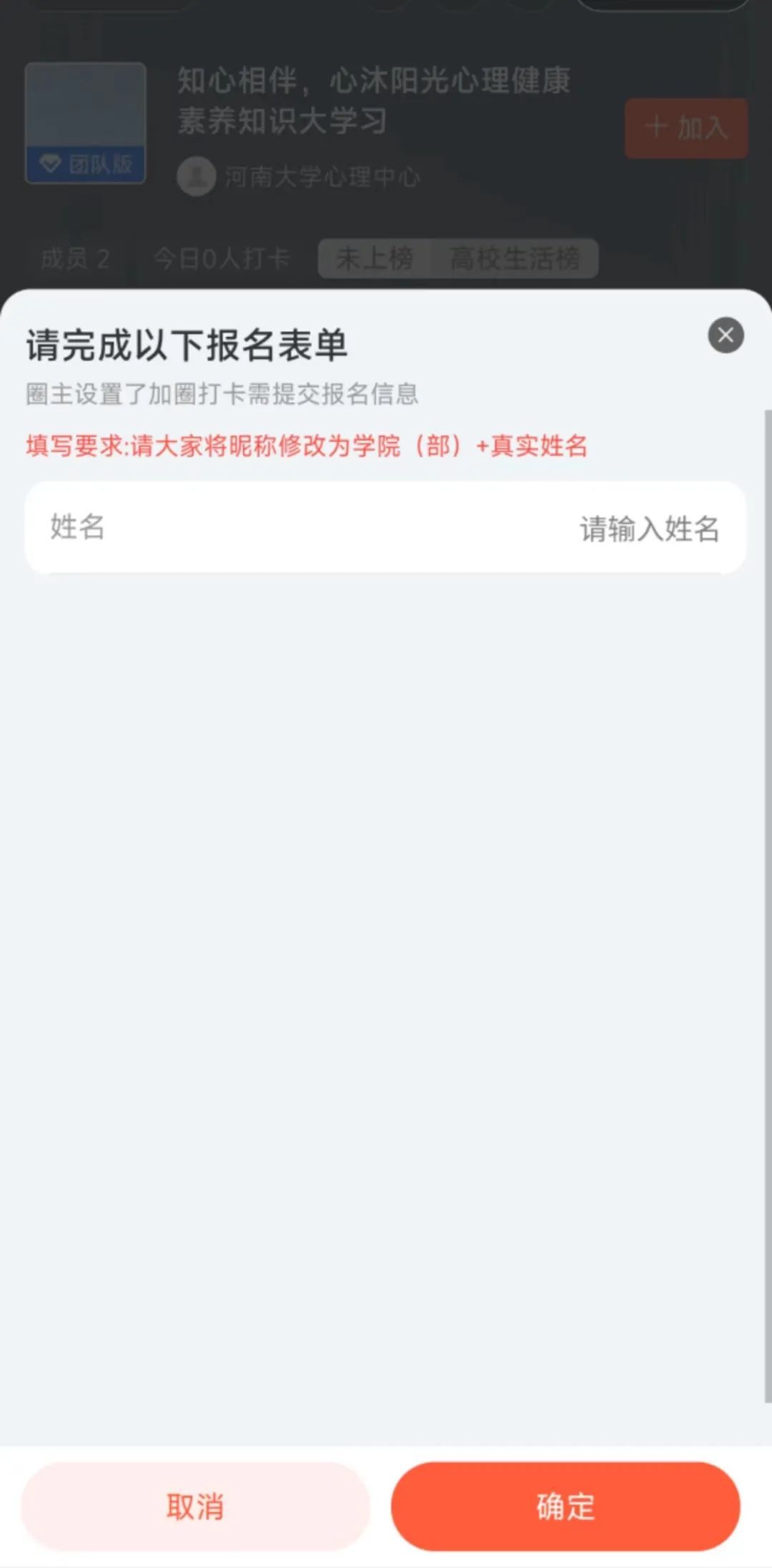(2)在“小打卡”程序上加入“知心相伴,心沐阳光心理健康素养知识大学习”,将个人昵称修改为学院(部)+真实姓名,在小程序上通过分享学习进度截图的形式完成每日打卡。