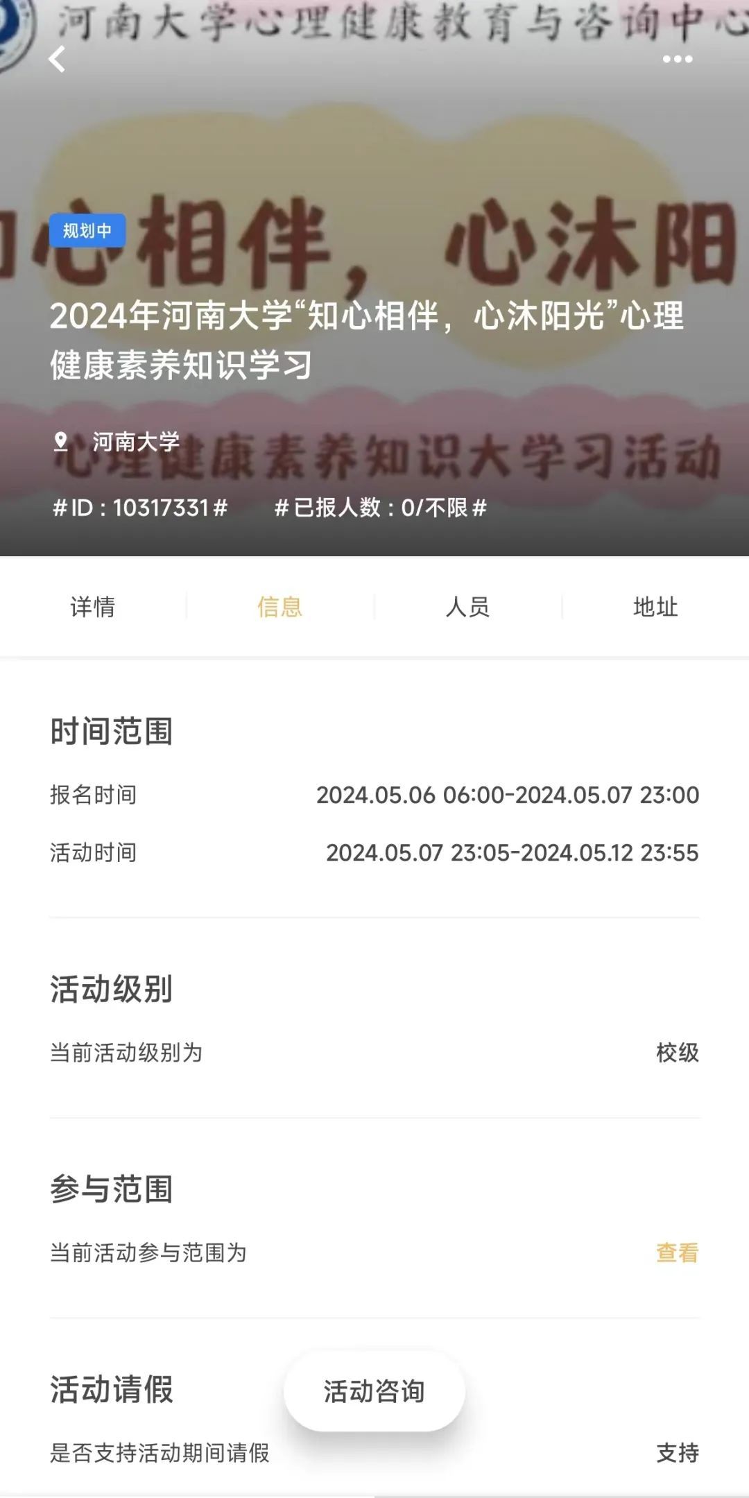 1.报名阶段:5月6日—5月7日,学生在到梦空间APP上报名“2024年河南大学‘知心相伴,心沐阳光’心理健康素养知识学习”。