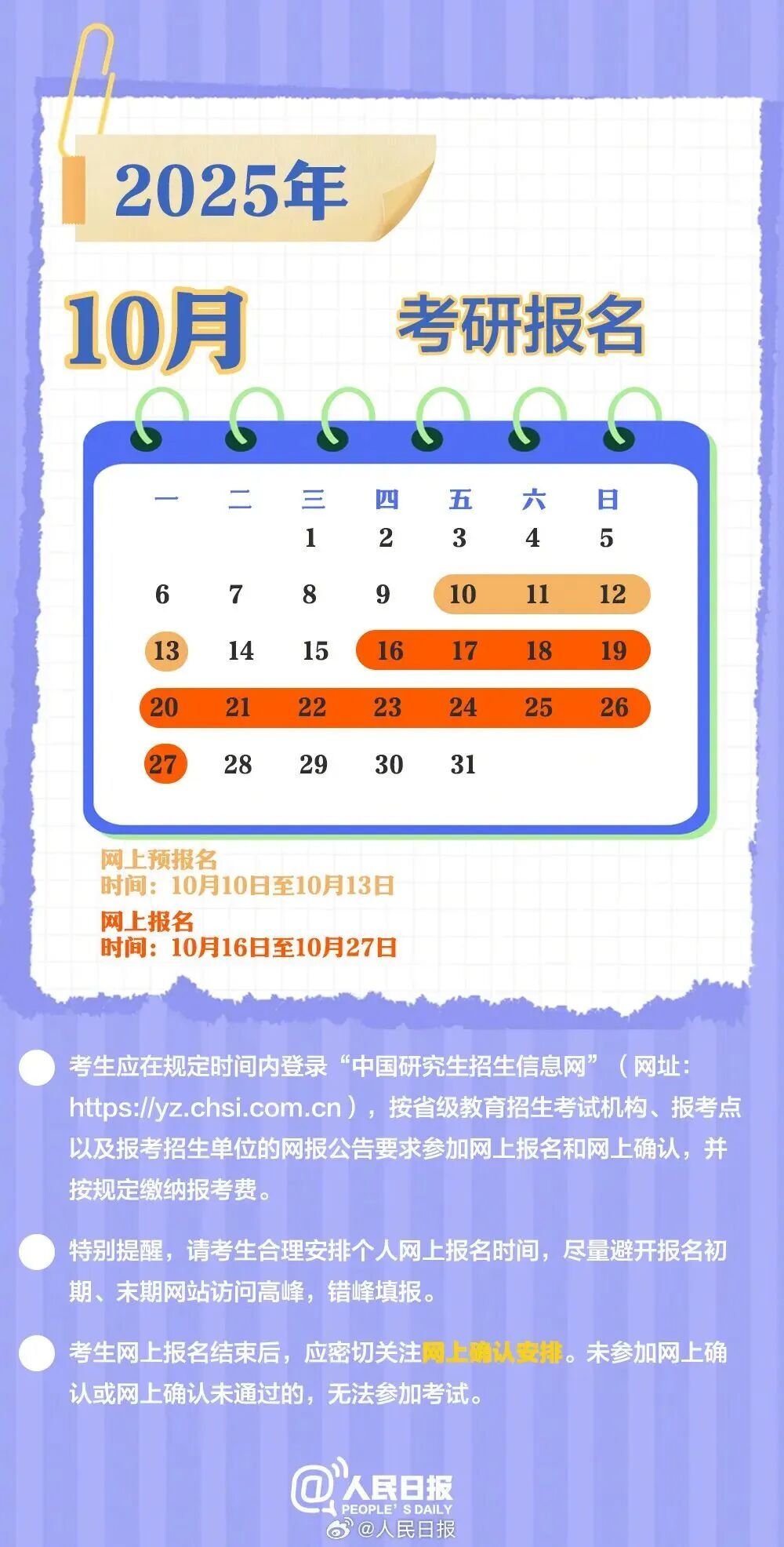 10月10日起开始预报名,考生可登录“全国硕士研究生招生考试网上报名平台”(网址://yz.chsi.com.cn)完成报名操作。请大家提前准备好个人相关材料,合理规划报名时间,确保报名流程顺利完成。