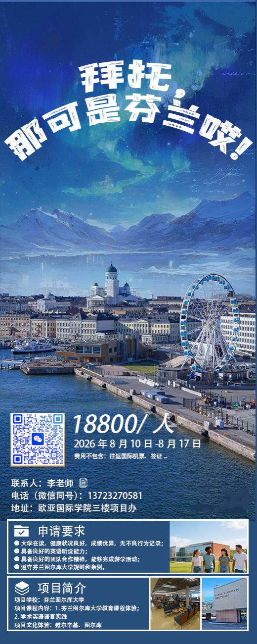 为进一步推动我校国际化人才培养,全面落实“全专业国际化人才培养计划”,拓展学生国际视野,提升创新意识与跨文化沟通能力,我院拟组织学生参加由芬兰图尔库大学主办的2026年暑期研修访学项目。现将有关事项通知如下: