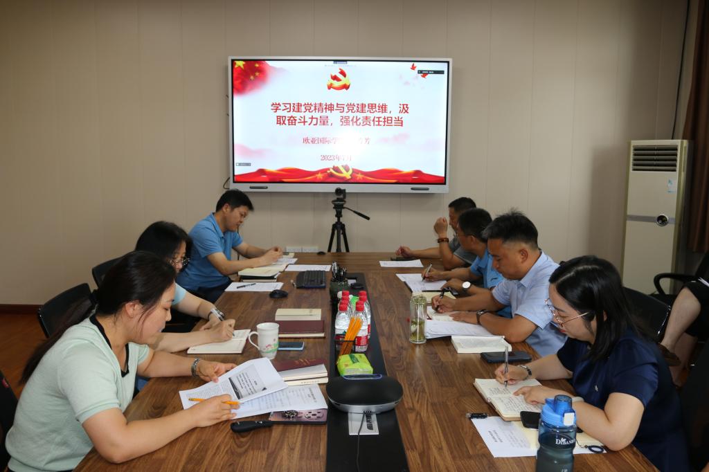 随后,学院在二楼会议室开展主题教育读书班集体学习。学院全体教职工通过线上线下相结合的方式参加了会议。副院长苏芳芳首先结合建党精神、党建重要理论、河南大学中外合作办学发展历程为同志们上了题为“学习建党精神与党建思维,汲取奋斗力量,强化责任担当”的专题党课。