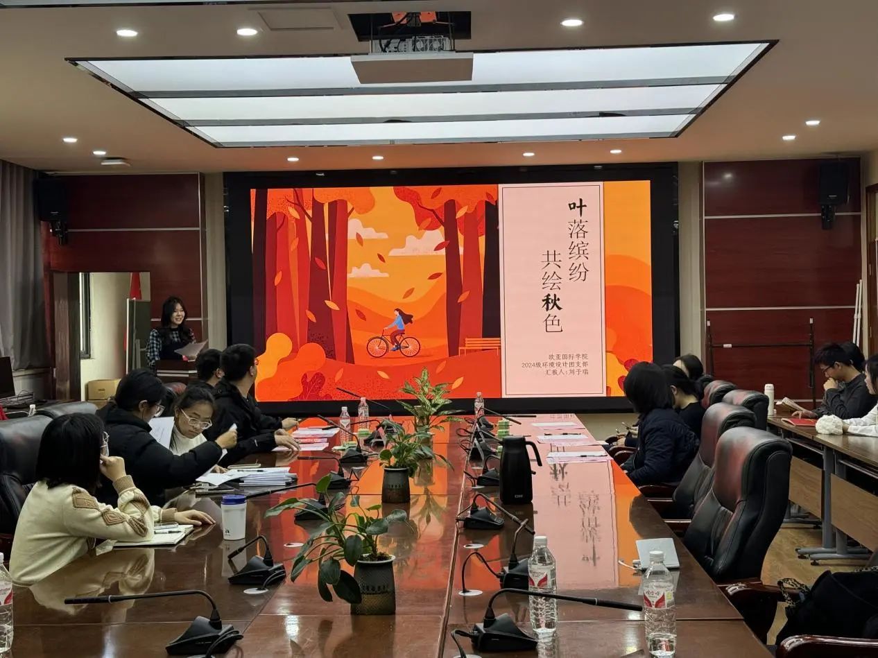 本次决赛于12月27日下午在金明校区生命科学学院二楼B201会议室举行。2024级环境设计团支部书记刘子瑞进行现场答辩。活动紧扣党的二十大精神,围绕生态文明建设主题,以“铁塔秋叶,创意无界”为核心,通过落叶艺术创作实践,引导团员树立绿色发展理念,增强环保意识和团队凝聚力。同时,活动紧扣专业特点,以艺术创作为载体,鼓励青年发挥创新思维,在亲近自然中展现青春活力与时代担当。