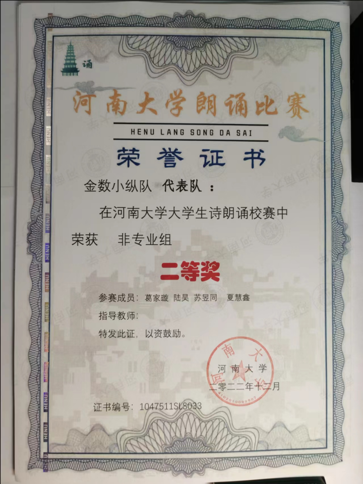 在学习之外,葛家璇同学德智体美劳全面发展,热爱书法、篆刻、摄影,热衷于传播中华优秀传统文化。她的书法作品曾入选两次河南大学书法篆刻比赛入展作品,获得了齐越节朗诵比赛校二等奖。