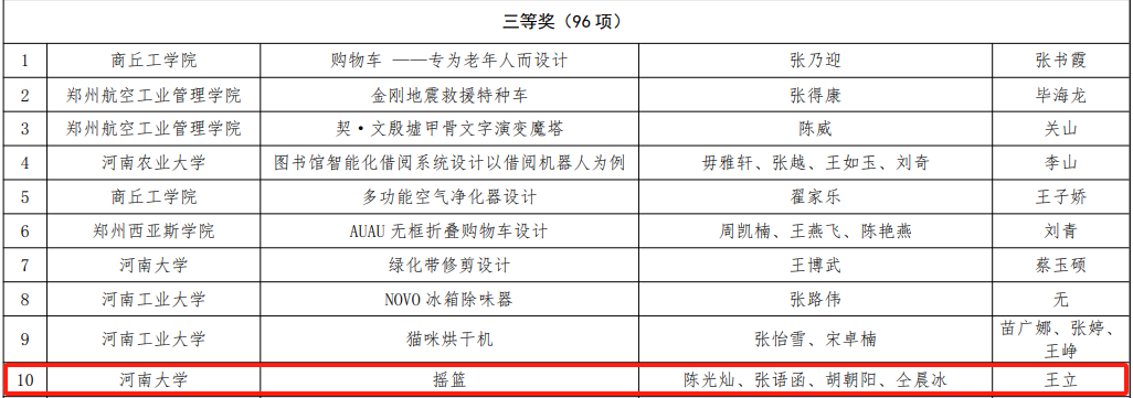 近日,河南省教育厅公布了2023“设计河南”系列大学生学科竞赛获奖名单,由我院学生陈光灿、张语函、胡朝阳、仝晨冰组成的队伍“摇篮”荣获省级三等奖。