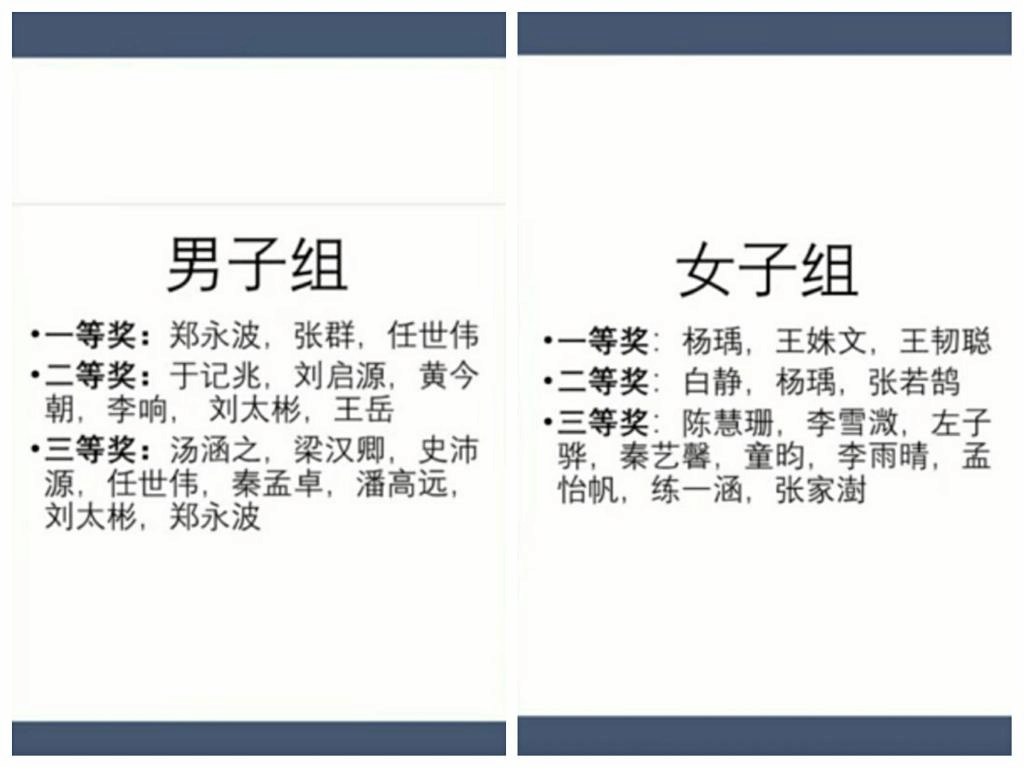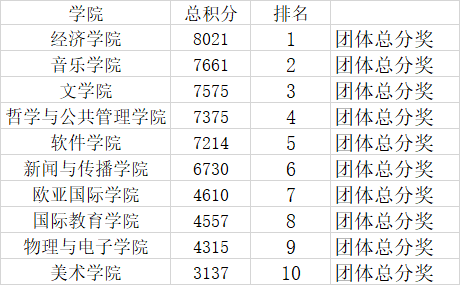 我院在本次比赛中,以4610分的总积分获得团体总分奖第7名,获得团体总分奖。其中,18级播音与主持艺术专业的郑永波同学以总积分274分的优异成绩取得男子组开合跳第四名;18级通信工程专业的杨瑀同学以总积分271分的优异成绩取得女子组开合跳第八名;19级通信工程专业的任世伟同学以总积分273分的优异成绩取得男子组深蹲第四名;19级土木工程专业的张群同学以总积分239分的优异成绩取得男子组深蹲第十六名。当然,还有很多同学也取得了不错的成绩。本次比赛我院学生共有6人获得一等奖,9人获得二等奖,19人获得三等奖。