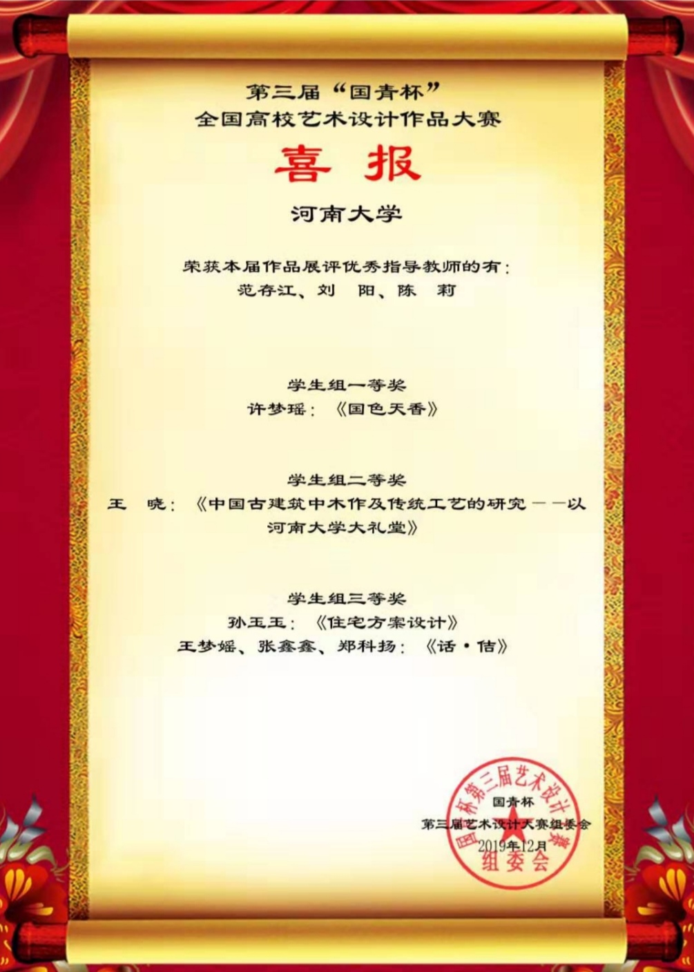 在此次大赛中,学院2016级视觉传达专业学子许梦瑶的美术类(国画)作品《国色天香》,获得一等奖。2016级环境艺术设计学子王晓的环境空间(建筑)作品《中国古建筑中木作及传统工艺的研究——以河南大学大礼堂》,获得二等奖,2016级环境艺术设计学子孙玉玉的环境空间(建筑)作品《住宅方案设计》、 2017级环境艺术设计学子王梦媱、张鑫鑫、郑科扬三人共同合作的产品造型(家具)作品《话·佶》分别获得三等奖。