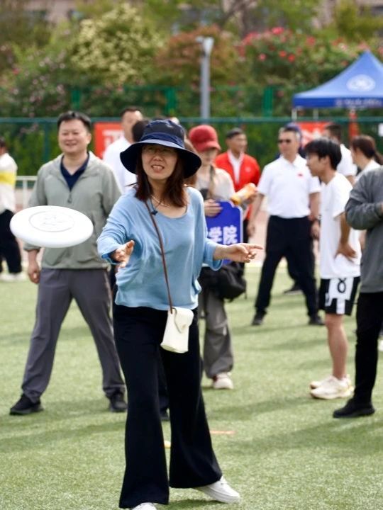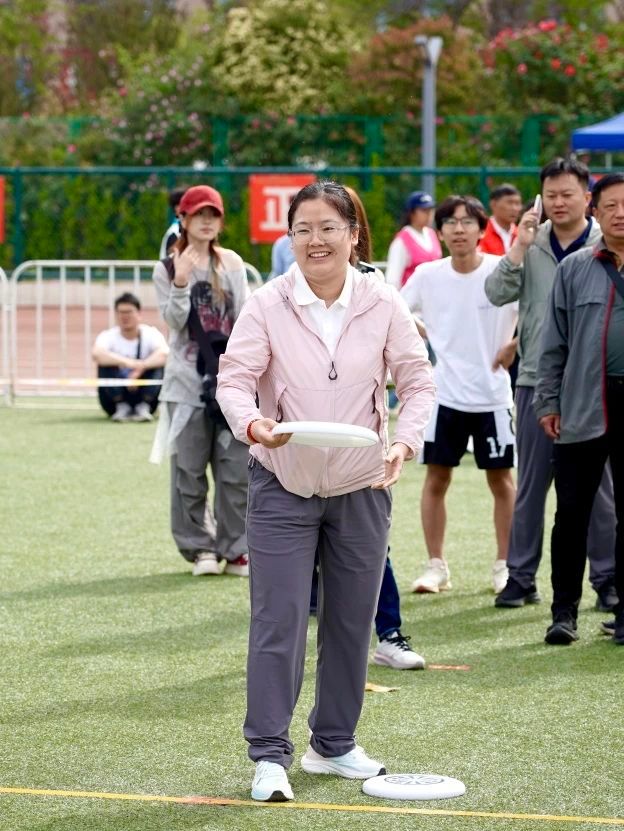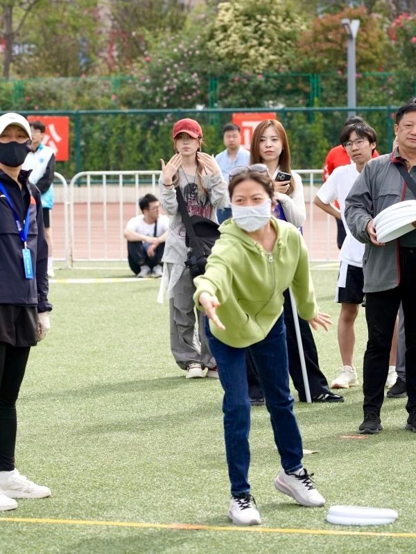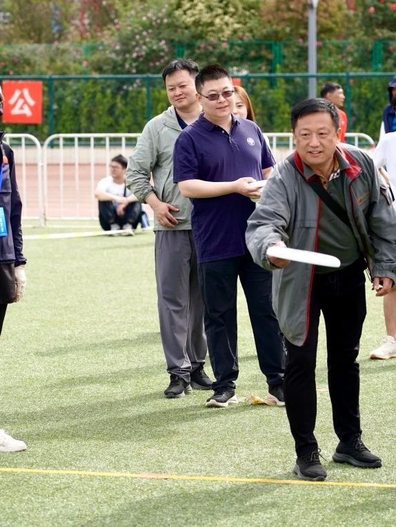 趣味项目成为全场亮点:“飞盘九宫格”趣味开战!参赛教师们执盘凝神,手腕轻扬,飞盘划出弧线精准落格。技巧与运气碰撞,欢呼与惊叹交织,方寸之间尽显协作之乐!“旱地龙舟”上,选手们们跨坐龙舟,口号震天,手脚并用“划”向终点。
