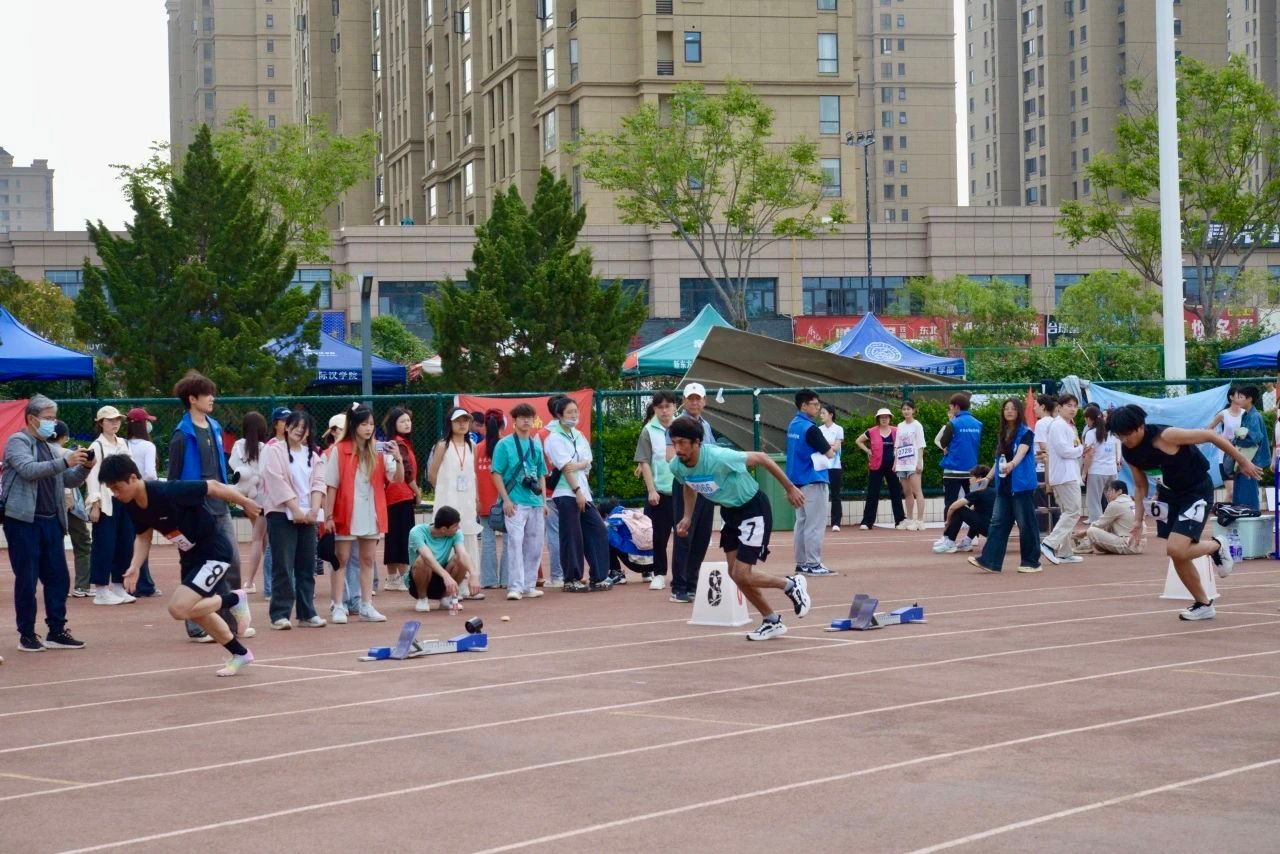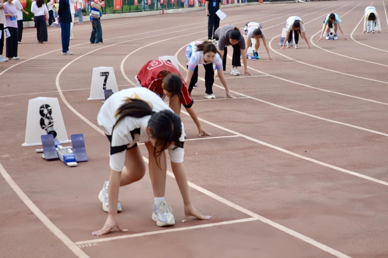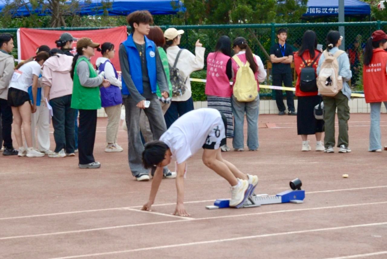 短跑赛道同样激情四射:男子甲组200米预赛中,选手2024级视觉传达设计专业侯宁宇如疾风掠过跑道,起跑时的爆发力与弯道时的沉稳控制相得益彰;女子甲组200米决赛则上演“速度之争”,欧亚女将们步伐铿锵,马尾飞扬,赛道旁呐喊声此起彼伏。