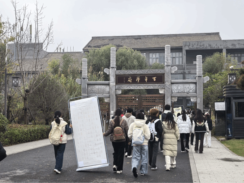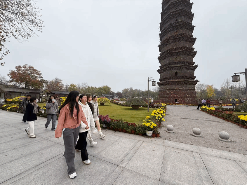 在秋意盎然的铁塔公园中,同学们漫步交流,感受自然之美,增强了对母校的归属感与集体认同。