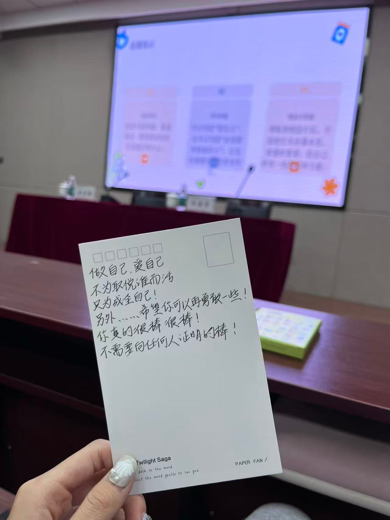 紧接着的互相写明信片环节,深深触动了每一位同学。笔尖流淌的真挚祝福、同学字里行间的鼓励认可,让大家忽然懂得,心灵的距离从未遥远。这份藏在卡片里的双向善意,如同冬日暖阳,驱散了偶尔笼罩心头的迷茫,也让同学们真切体会到,真诚的表达与倾听,是滋养心灵的重要养分。