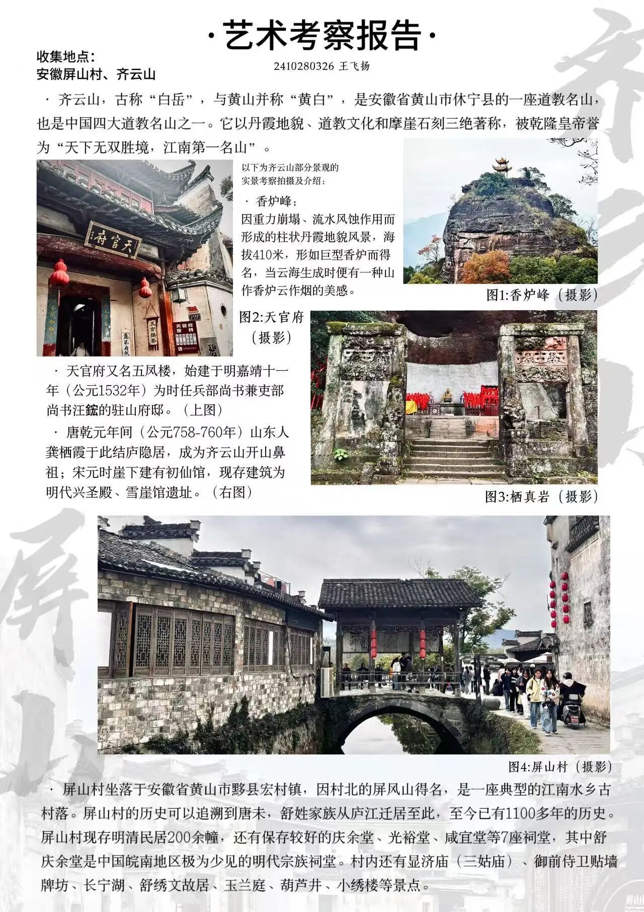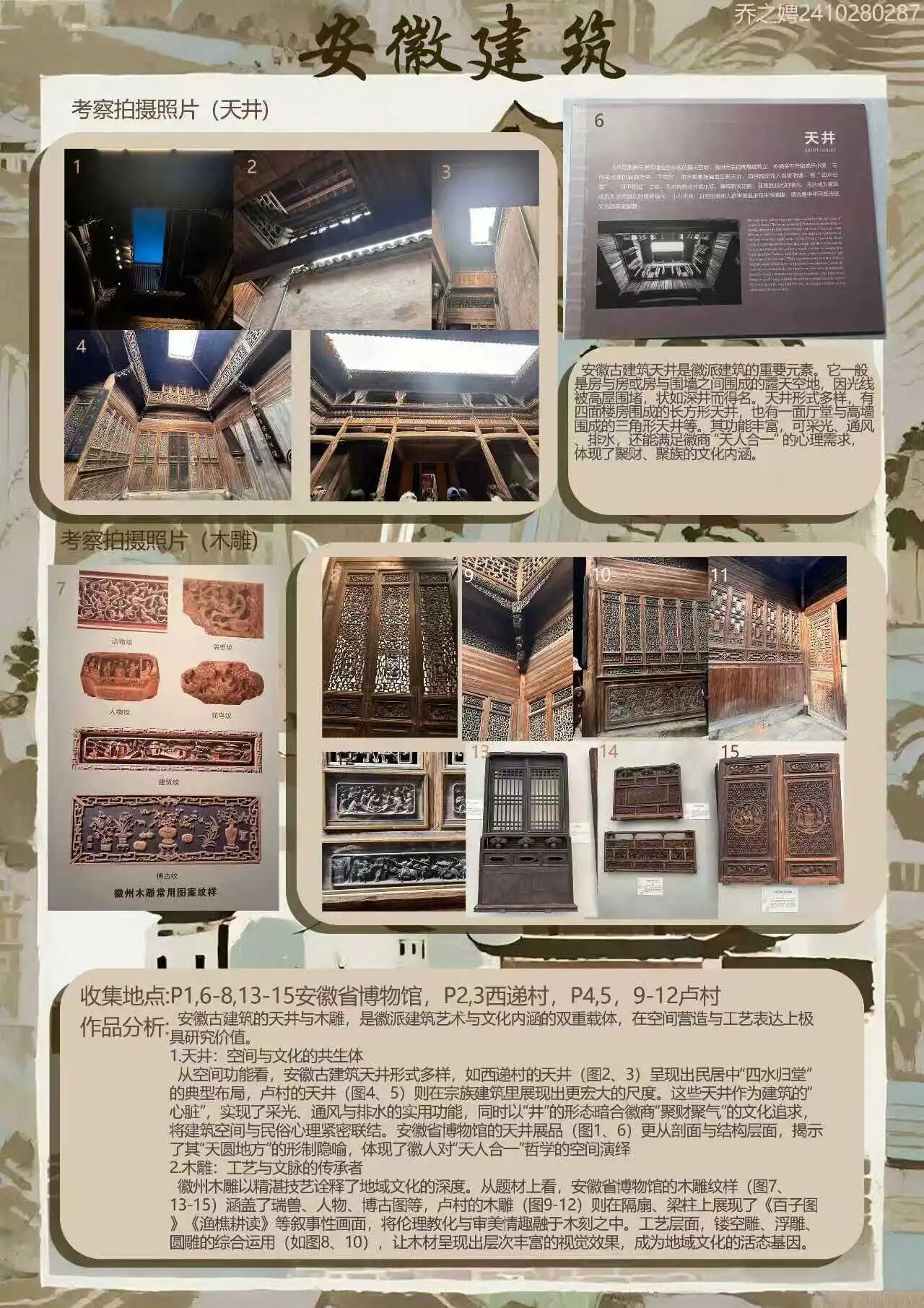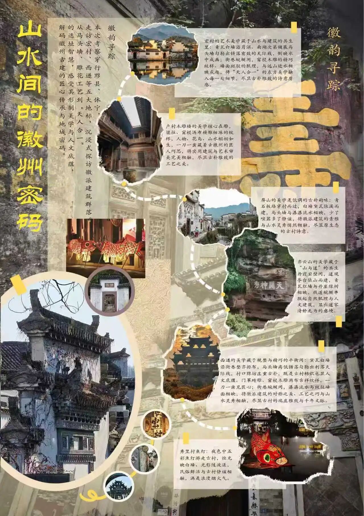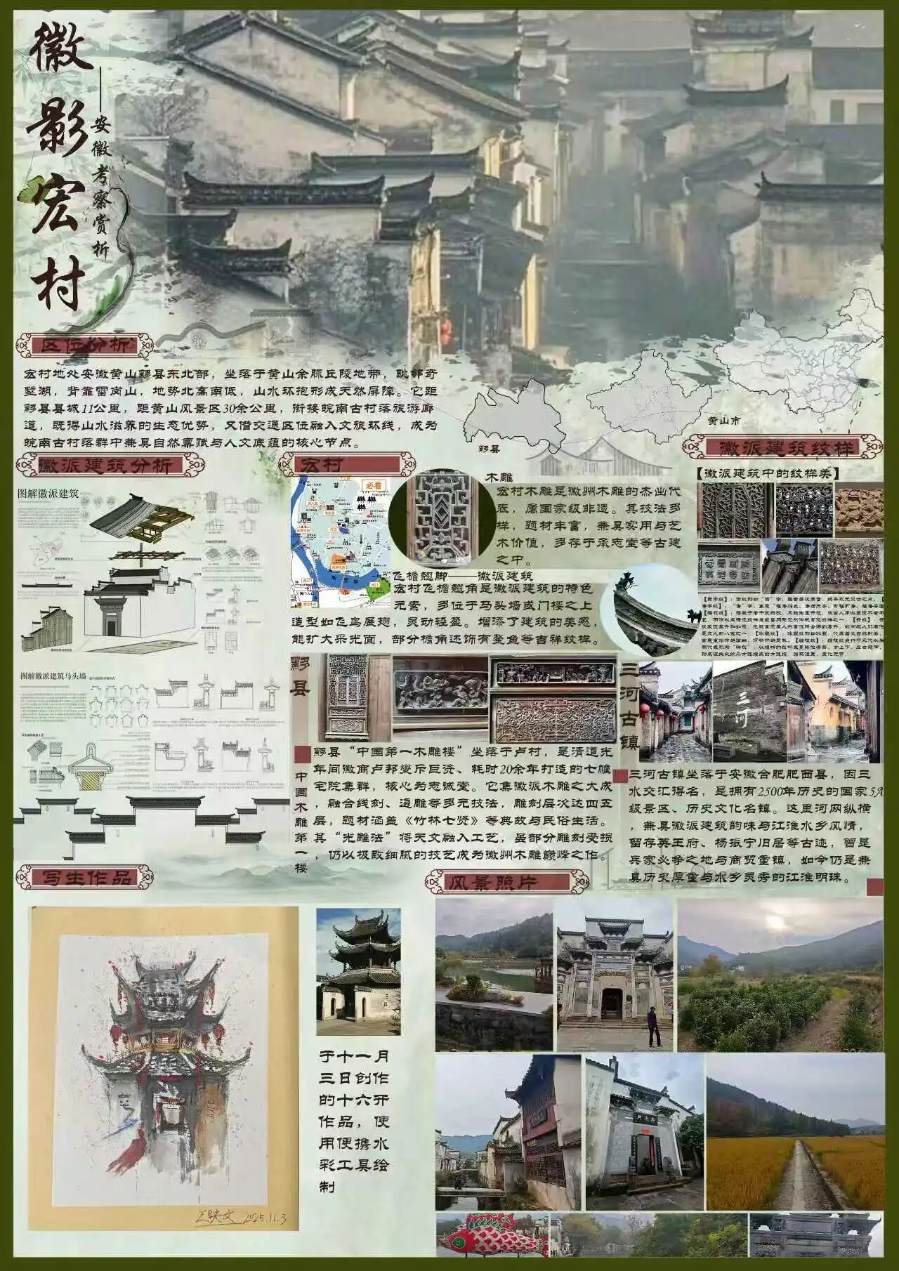 为探寻时光深处的文明印记,SPBO手机版 2024级视觉传达设计专业学生走进安徽的青山绿水与古老街巷。这是一次融合历史感知与自然体悟的行走课程,在徽州古道白墙黛瓦的村落间,同学们用专业视角重新解读这片土地,他们用画笔与镜头,记录下一个个触动心灵的瞬间。现将考察期间优秀学生作品进行展示(作品不分先后,因客观条件限制,未能将所有作品进行展出)。