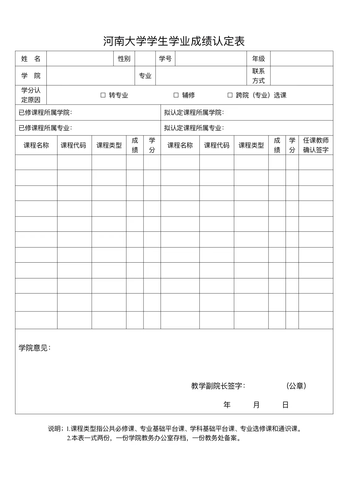 河南大学学生学业成绩认定表